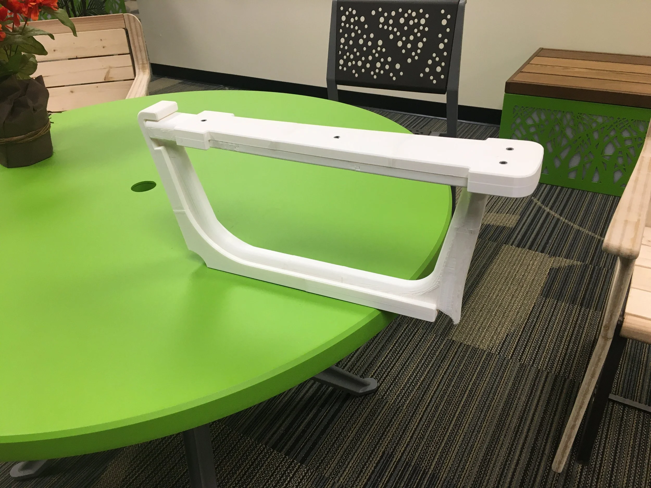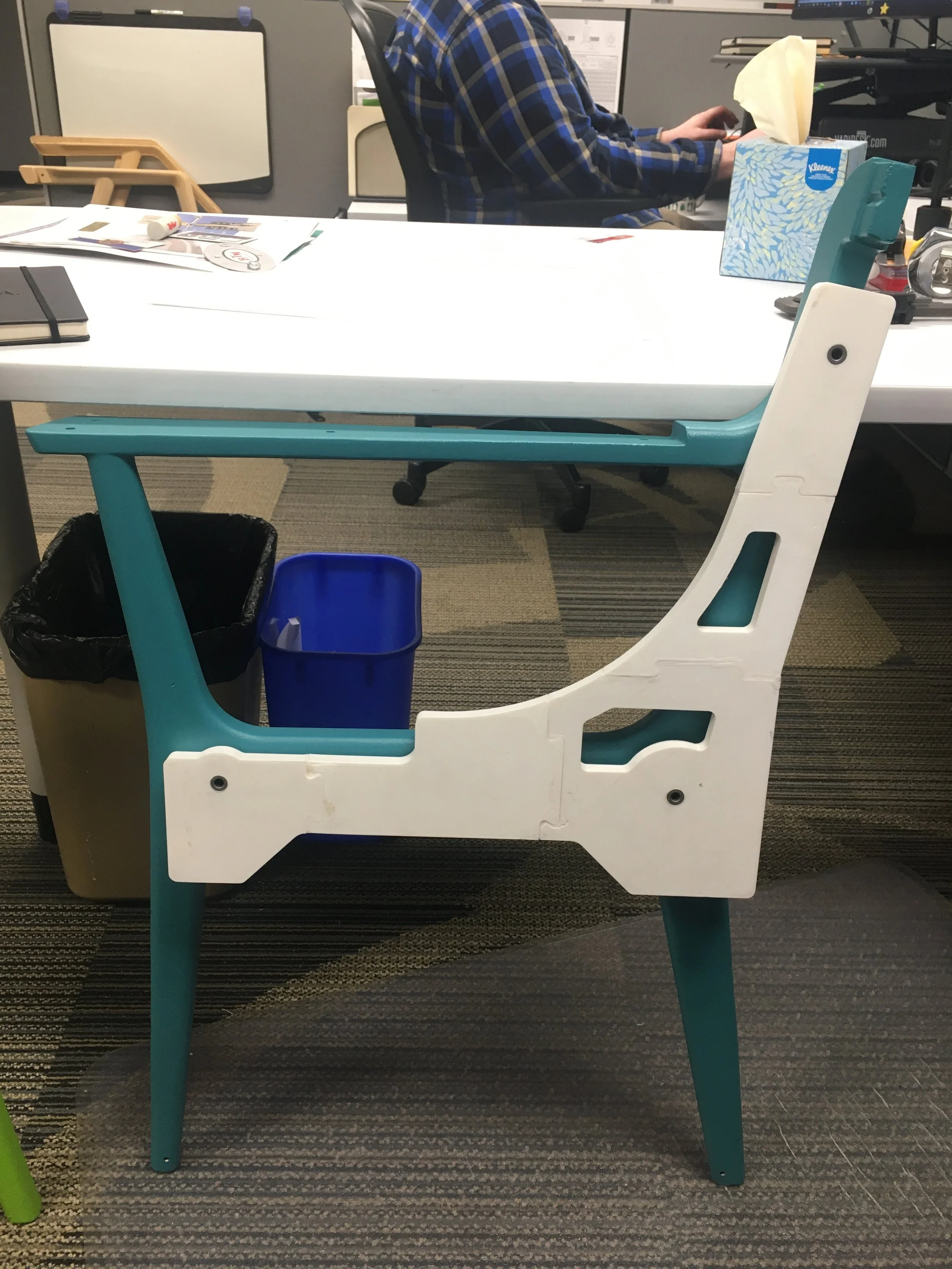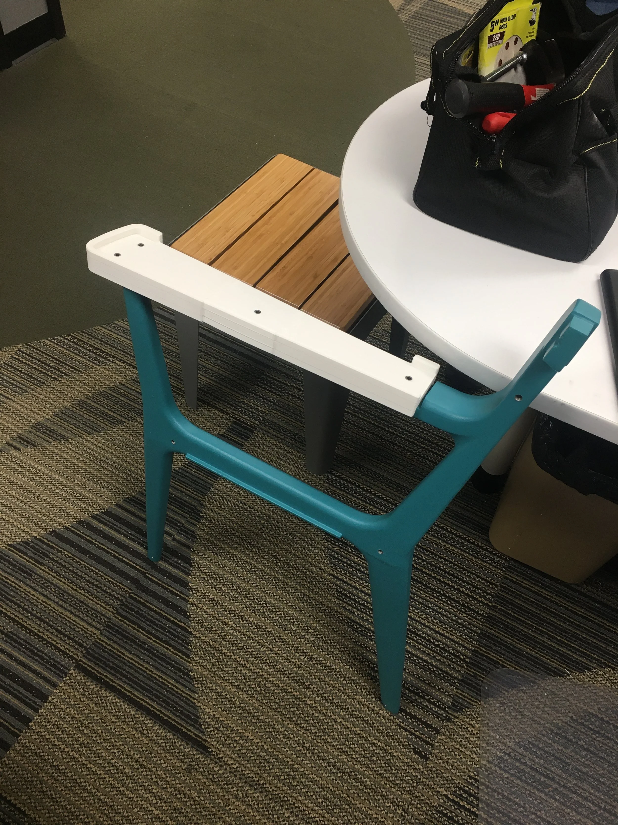 Most of the table designs submitted for this project were a pedestal style table. we discovered that is we used four individual legs as the corners we could maximize the number of wheelchairs that could fit at the table. We added a rim around the edge of the table top to help highlight the perimeter of the table and coated it in a insulating coating.