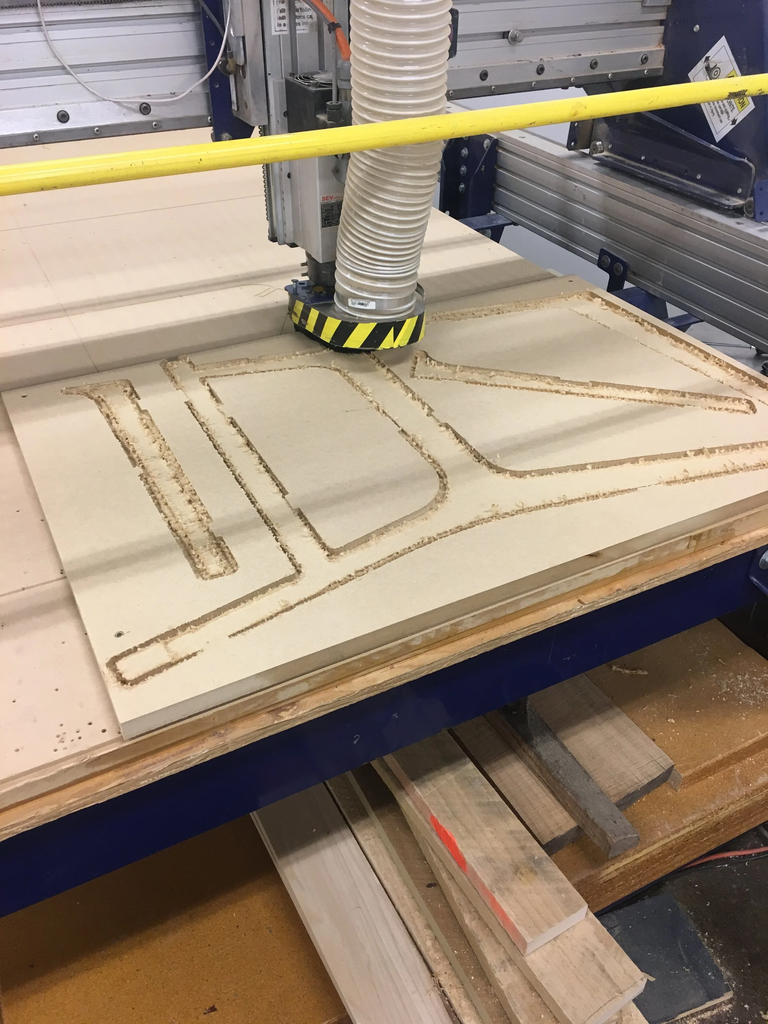 After 3D printing one twelfth scale models of every part of the collection, we made a full sized prototype of the dining chair and lounge chair to verify the ergonomics with users from an assisted living facilities. I used a 3-axis CNC router to cut the castings out of MDF and I welded together a steel frame for structure.