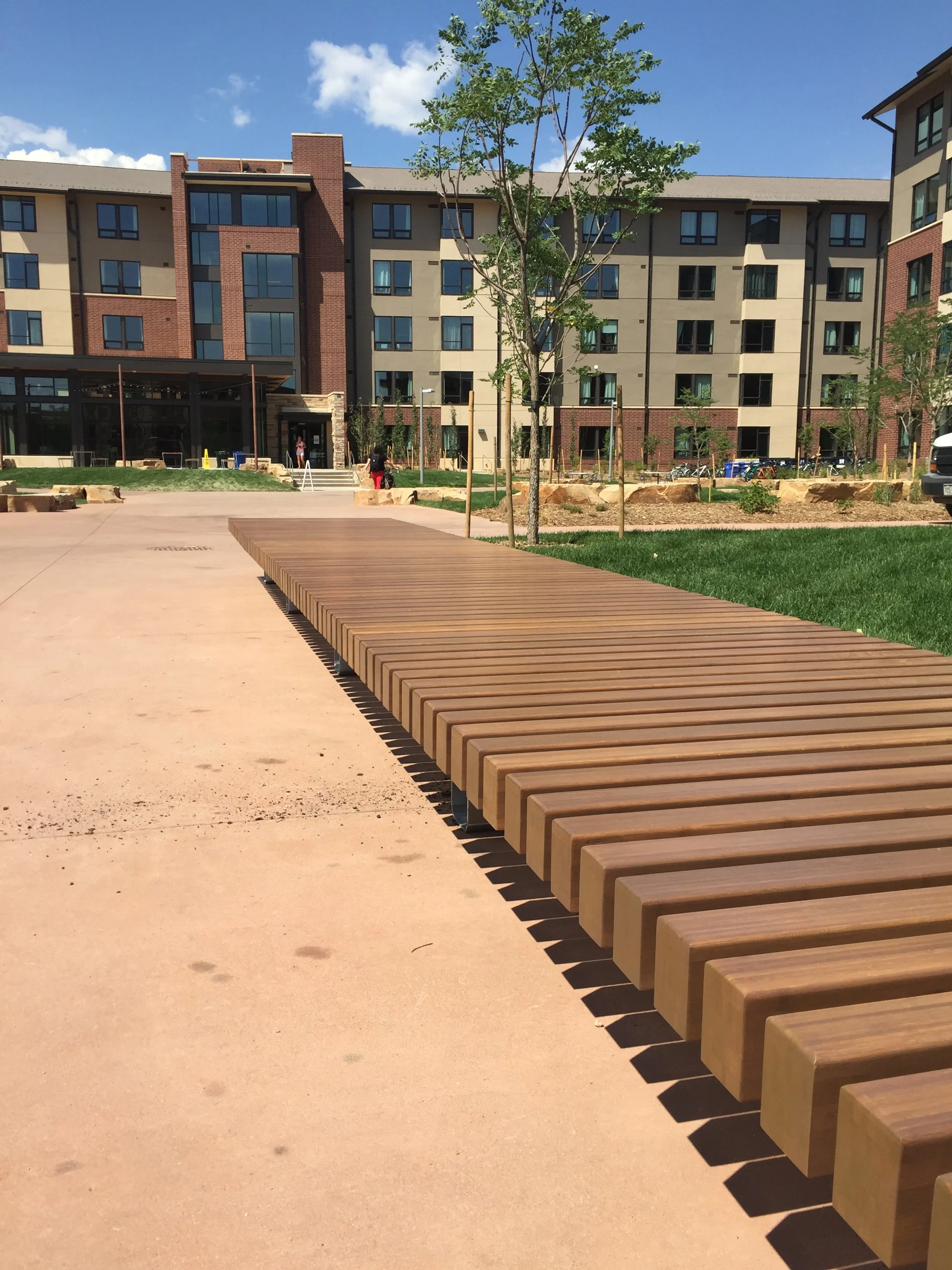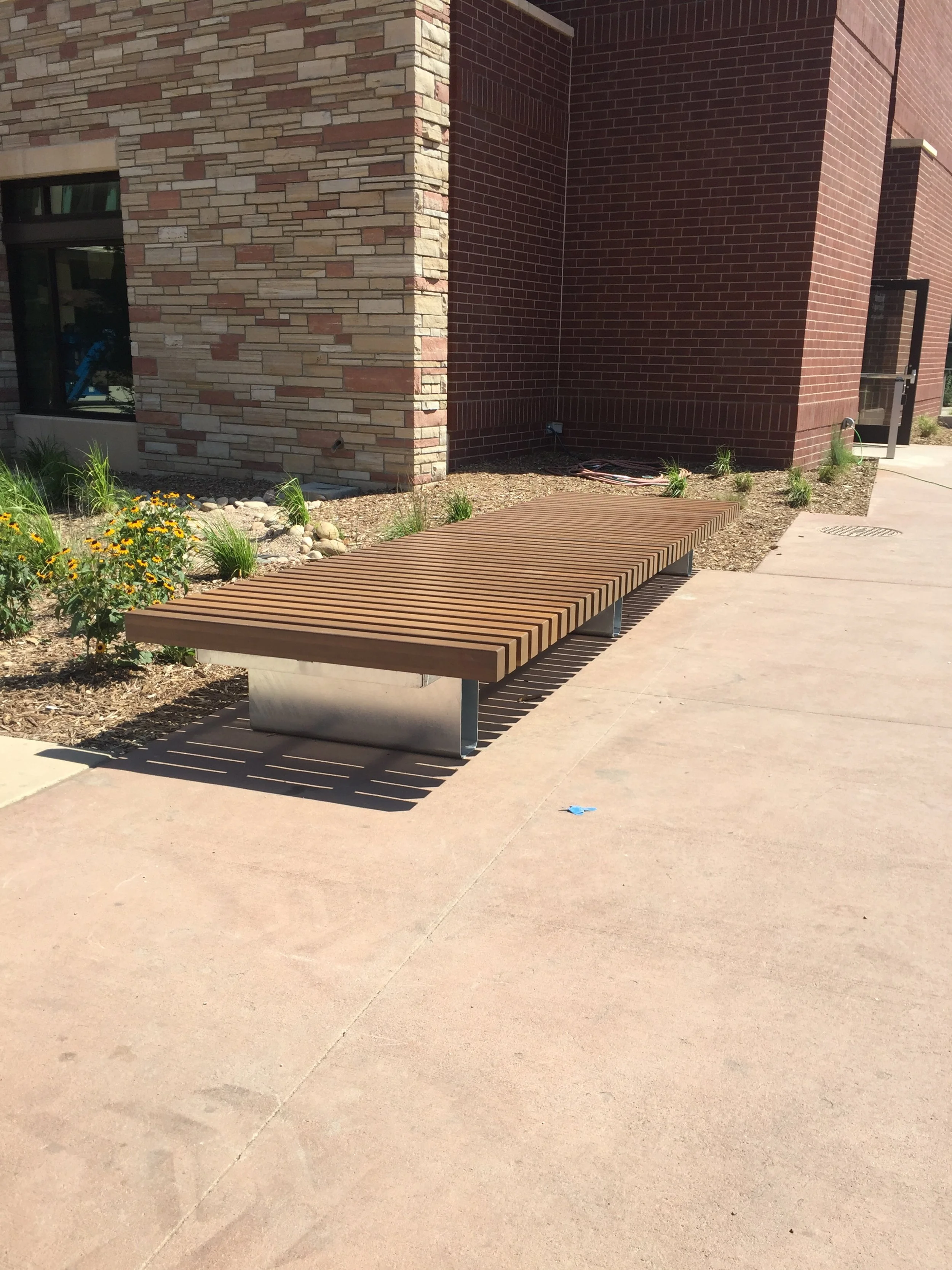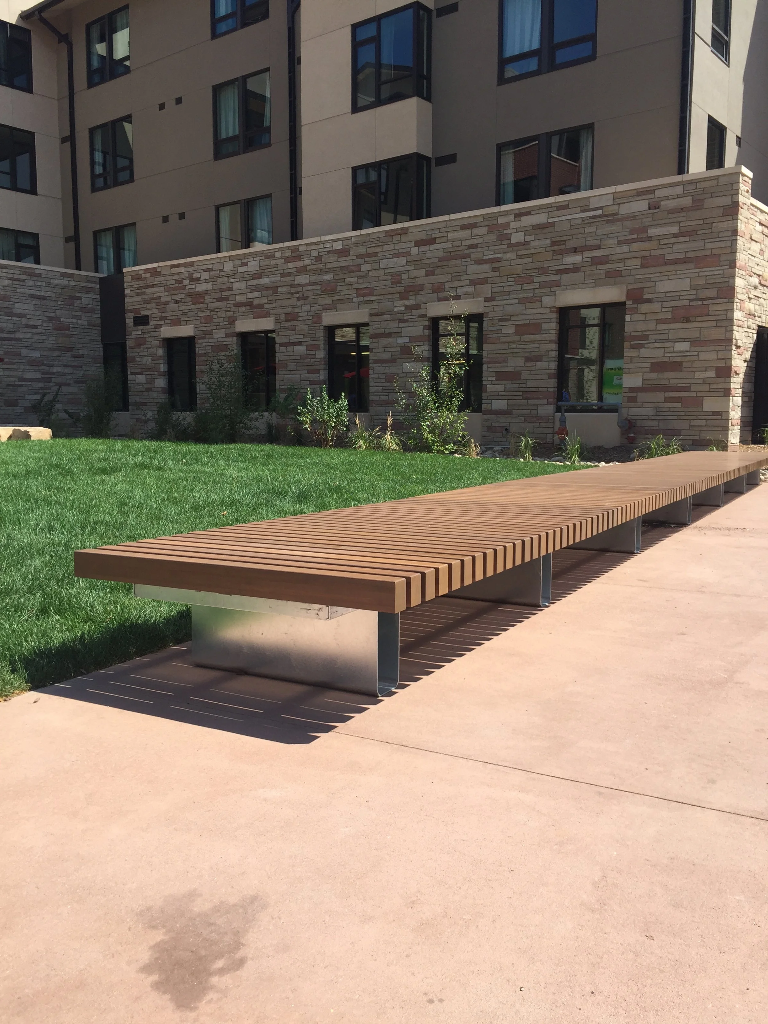 The Infinity bench system started as a custom project for a housing complex at CSU. They needed five massive four foot wide benches. One curved bench with a 75 foot arc length and four Linear benches ranging between 13 and 39 feet long. The supports were made in house using turret punched parts and the horizontal under-support was made from outsourced laser tube parts. The whole under structure was hot-dipped galvanized and the planks were laminated bamboo treated with stair and sealer.